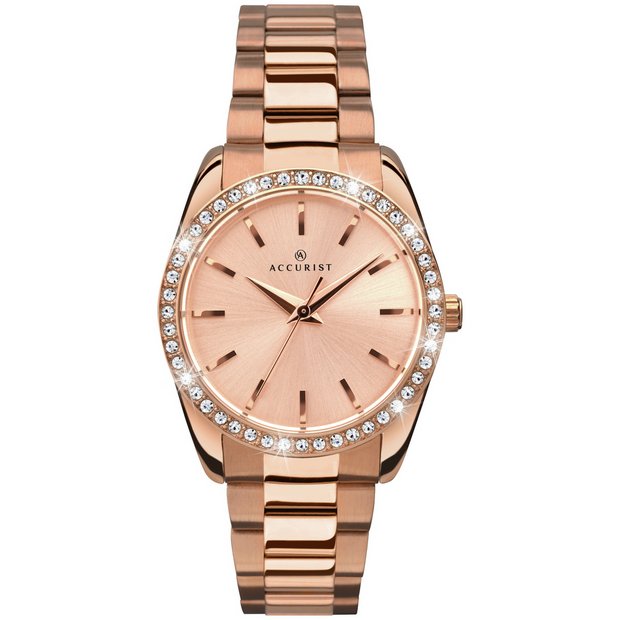 Product description a unique accurist womens timepiece this watch features a rectangle rose gold plated stone set case rose gold plated stone set bracelet and a elegant rose dial with batons. Accurist ladies gold plated bracelet watch. Fossil ladies rose gold bracelet. An elegant watch and bracelet set by accurist with the watch functioning to a high capacity ideal for smart and evening wear.