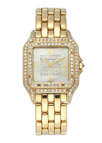 Distinguished by its articulated bracelet square case with rounded corners and roman numerals the panthere de cartier watch is a true 1980s icon. The collection features 26 models including double and triple loop variations as well diamonds paved pieces that serve as a dazzling homage to the 1980s. Panthere de cartier womens watch 3 rows gold with original box paperwork. Mother of pearl sunrise dial.