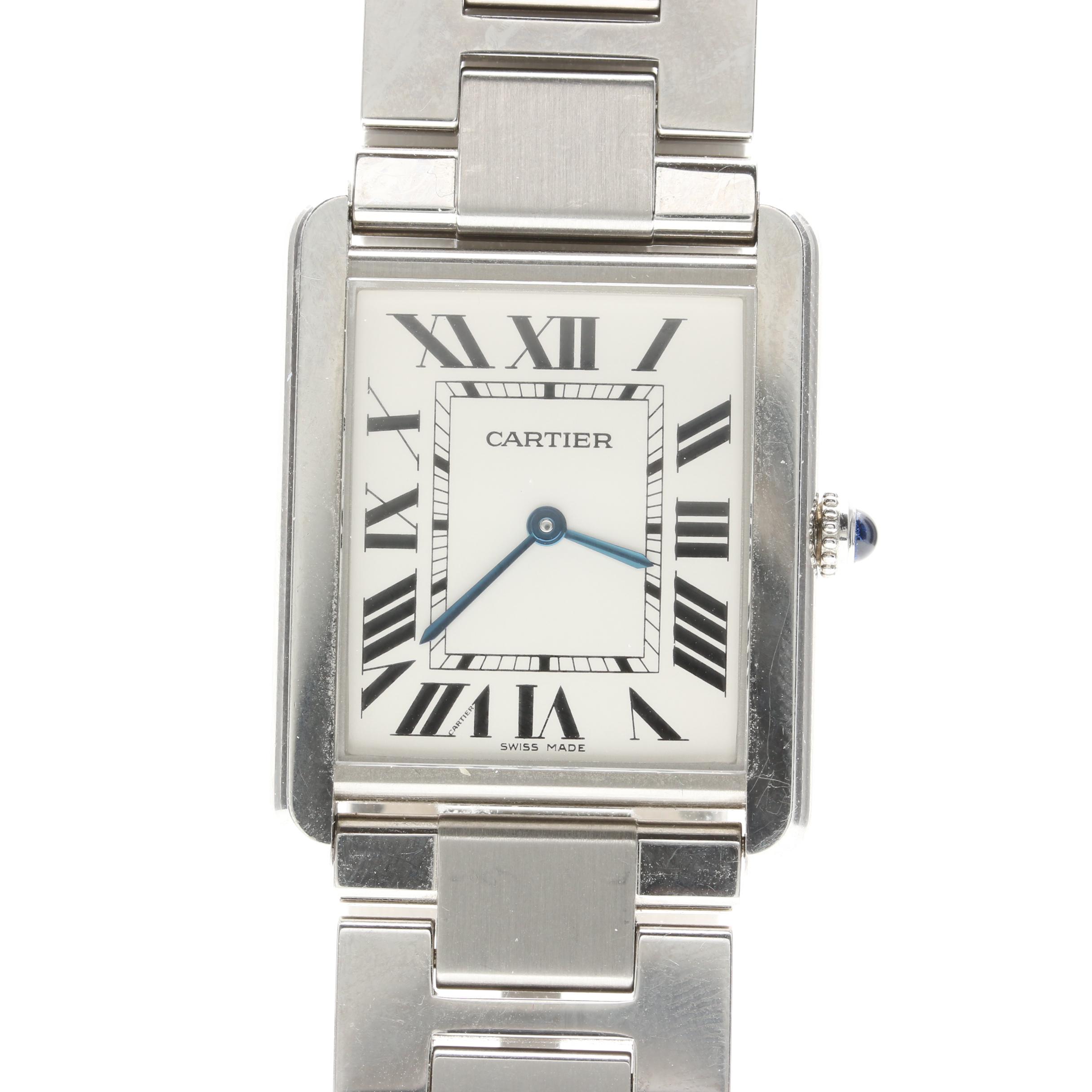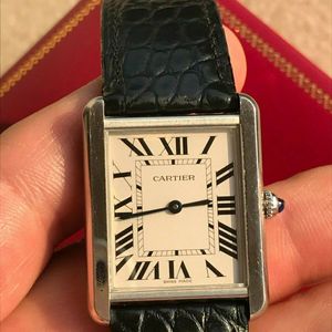 Tank cintree is narrow slender slightly curved and can be said to be the most elegant of the tank watches. Cartier tank solo watches are a part of the tank series of cartier watches which first appeared in 1917 inspired by actual tanks on the western front of world war i. Steel case beaded crown set with a synthetic cabochon shaped spinel silvered light opaline dial roman numerals blued steel sword shaped hands sapphire crystal black grained calfskin interchangeable strap steel double adjustable folding buckle. We buy sell and trade in brand new pre owned cartier watches.