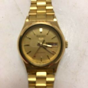 Womens gold tone seiko 5 automatic dress watch. Only 4 left in stock order soon. 39 out of 5 stars 43. It also features a polished gold toned stainless steel case and a textured gold dial with luminous gold hands gold hour markers and englishspanish day and date box at three oclock.