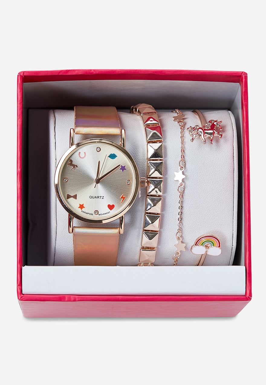 The case houses a complementing rose dial with contemporary batons. Folio womens rose gold tone watch interchangeable strap and bezel set sale 2999. Womens chronograph runway two tone stainless steel bracelet watch gift set 38mm 39500 sale 27650. Available in a variety of styles for him and for her featuring matching bracelets necklaces earrings and even cufflinks youre sure to find the perfect set.