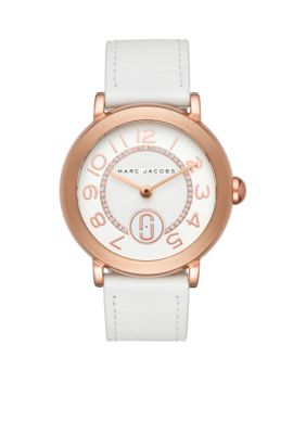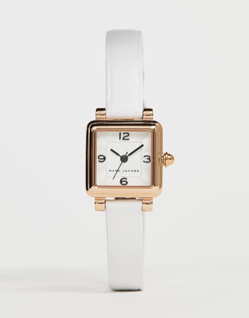Go casual or refined with fine womens watches from the marc jacobs collection. New for spring 2017 the marc jacobs roxy watch showcases the brands signature style with a white satin finish dial and the letters m a r c as the first four indexes. Mix and match straps the mask collection the snapshot the traveler tote bag the collaborations the collection world of marc new arrivals. A polished gold tone 36mm case and black leather strap add a cool finishing touch.
