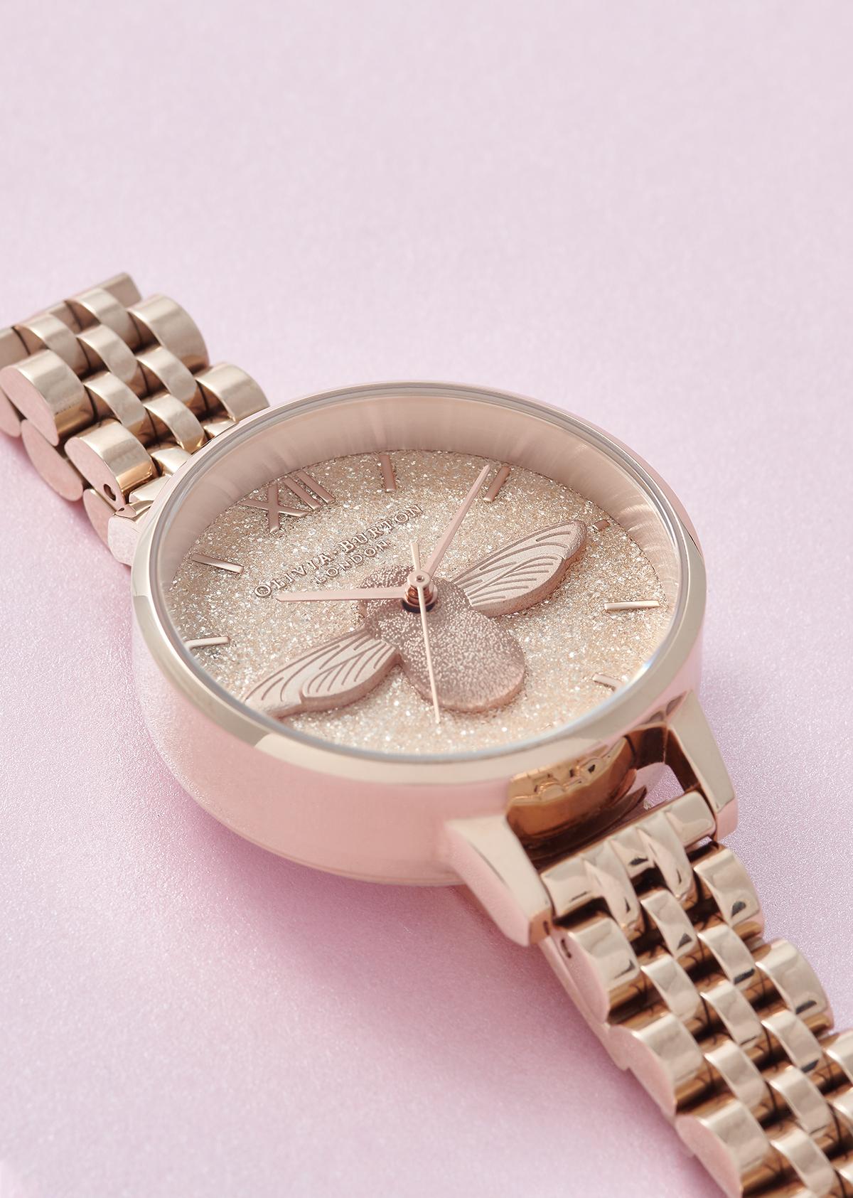 Wear all day every day. Olivia burton 3d bee square dial pale rose gold mesh watch ob16eg152. At first glance the range of watches may appear simplistic but thanks to olivia burtons obsessive. This variety in size means watch lovers can choose between a statement piece that makes an impact and a small watch that adds subtle detailing to an outfit.