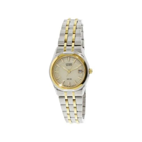 Citizen womens eco drive sport two tone watch with date ew3144 51a citizen womens drive japanese quartz watch with stainless steel strap silver 165 model. Featured in two tone stainless steel with a white mother of pearl dial and date. Stainless steel silver or two tone stainless steel. Ladies eco drive silhouette two tone watch ew1264 50a solar powered.