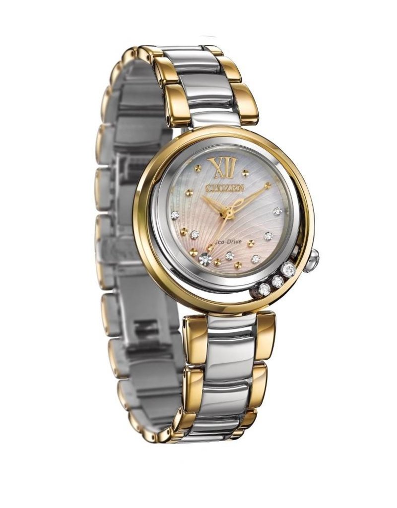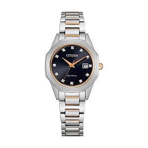 An unexpected 12 sided bezel lends a dash of extra style to this 3 hand citizen eco drive in stainless steel two tone with 27mm screw back case. The citizen elektra with dazzling diamonds is powered by any light and never needs a battery with eco drive technology. 44 out of 5 stars 165. Additional features include day date indicator set within a white dial luminous hands water resistance to 100 meters and foldover clasp with push button.